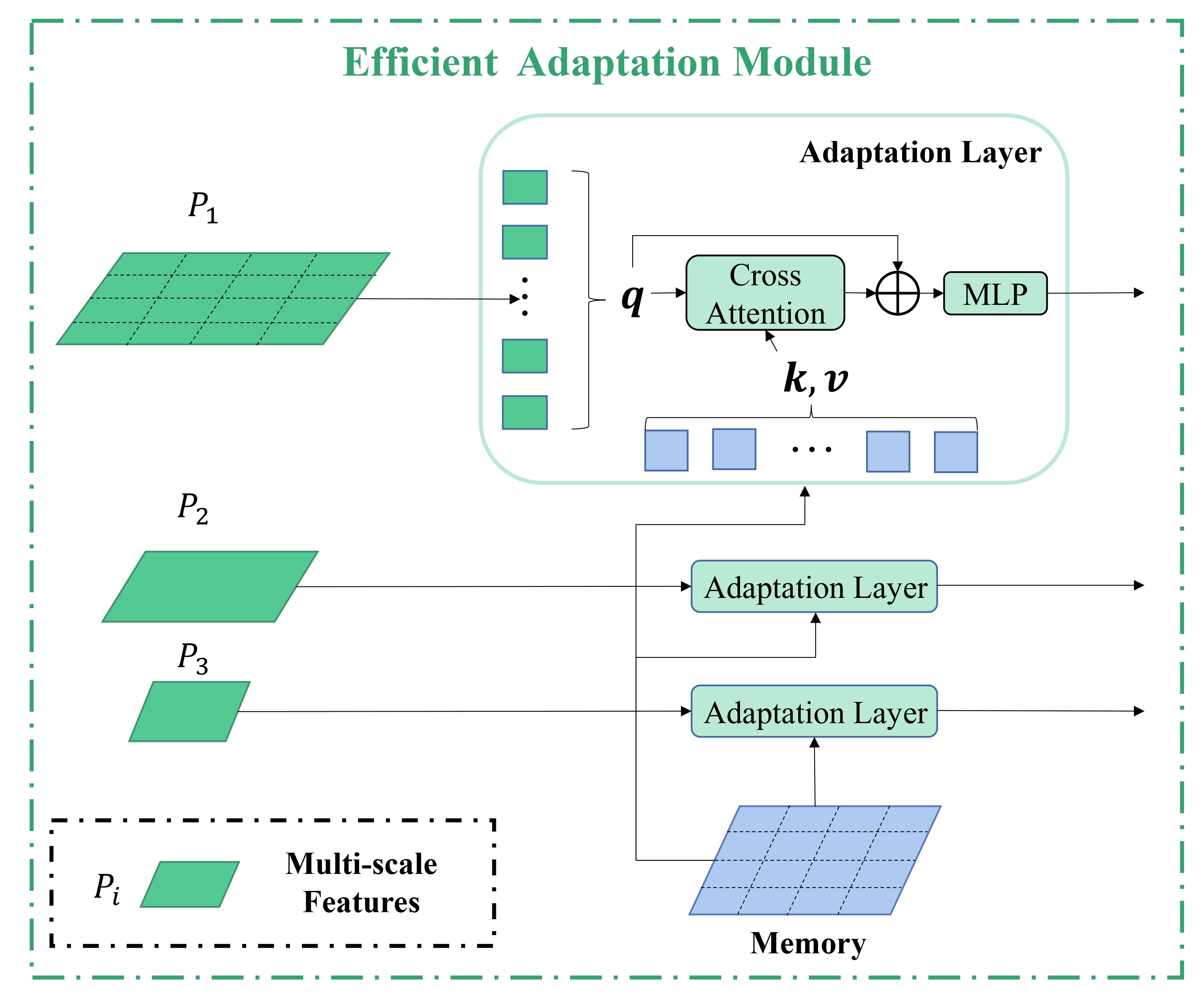 Overall pipeline. The proposed MS2A consists of two core parts. In the memory storage module, we first use the source data to train a base detector (we use YOLOX in practice and name this process prior learning), and use the base detector to extract prior knowledge for both source data and unlabeled target data. The prior knowledge is refined through clustering and momentum updates and stored as memory. On the other hand, in the memory adaptation module, we introduce an efficient adaptation module, which utilizes the memory to align the source data with the target data adaptively.